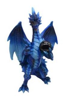 Powerful dragon holding a sphere stands ready for action. The icy blue colors make this statue unique and stand out. Painted resin.