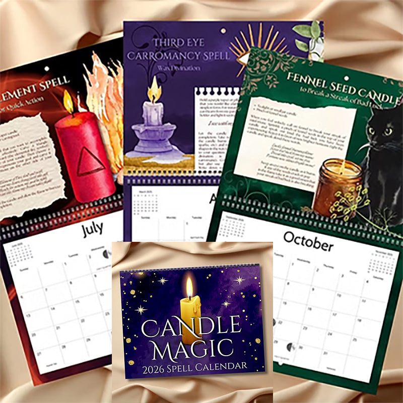 A year of guided candle spellwork! This witchy wall calendar features a unique candle magic spell each month. Magic for purpose, prosperity, breaking bad luck, wax divination and more. Includes moon phase icons and a mystical aesthetic that appeals to modern witches and magic workers of all traditions. Includes moon phases icons and new/full moon signs, designed in USA, printed on silk coated paper, and spiral bound.