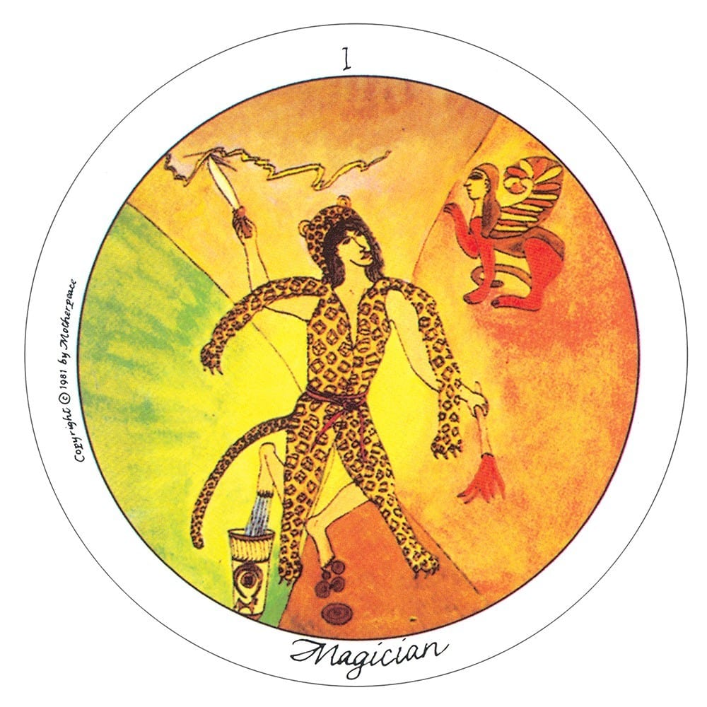 The creators of Motherpeace Tarot have departed from traditional (and often patriarchal) imagery of tarot, and have instead embraced the goddess spirit. The feminist emphasis is balanced with several male figures present in the deck. Motherpeace’s round cards and primitive artwork allow the reader to rely on intuition rather than standard “black and white” meanings.